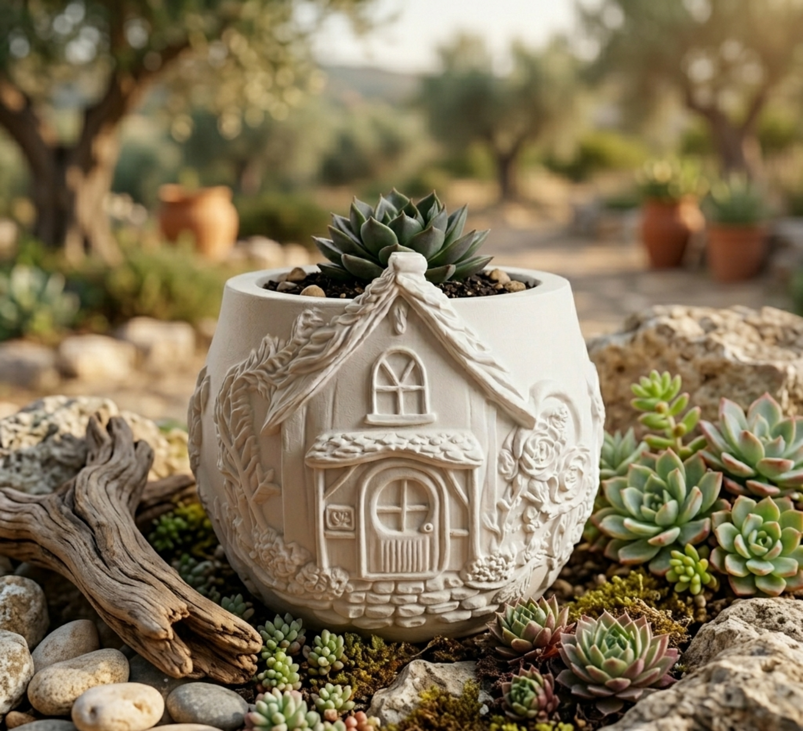Αυτό το χειροποίητο δοχείο δεν είναι απλώς ένα αντικείμενο. Είναι μια ζωντανή πύλη για τη δική σας γωνιά ηρεμίας και θαλπωρής. Κάθε λεπτομέρεια —από τα σμιλεμένα τούβλα μέχρι τα πέταλα των λουλουδιών— έχει xυτευτεί με αγάπη, για να φέρει τη μαγεία της εξοχής και τη νοσταλγία της παράδοσης στον χώρο σας.